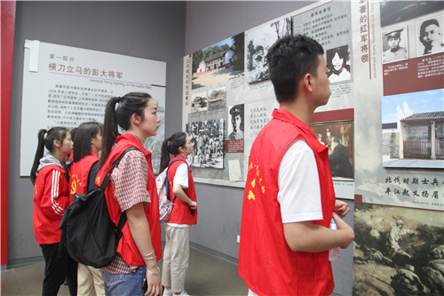 在前往岳阳长达两个小时的车程中,师生们《强军战歌》《浏阳河》等一系列动听的歌声不绝于耳,活跃着旅途氛围。抵达平江起义旧址,首先映入大家眼帘的是高达7.22米的彭德怀铜像。大家在解说员的讲解下逐步了解了平江起义的各个阶段,听到了起义中发生的英雄故事。随后,大家来到平江起义史料陈列馆参观流传至今的起义文物。看着一幅幅照片、观察着一辆辆独属于那个时代的交通工具,师生们仿佛置身于那个年代,枪炮声、呐喊声似乎就在耳边响起。