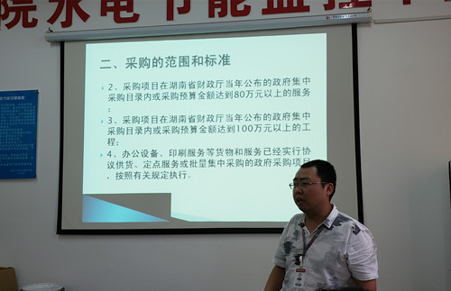 目前的“采购制度、采购组织形式、采购范围和标准、校内集中采购的操作程序、校内分散采购的操作程序”等五个方面对《湖南工业职院采购管理办法》《湖南工业职院分散采购实施细则》进行了详细解读。他在阐明政府采购、糖心vlog