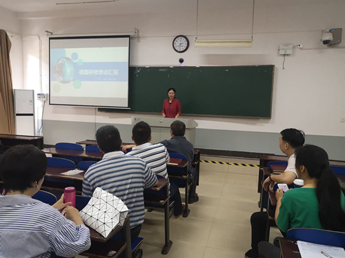 左园园老师对此次参培过程进行了简要的介绍,并详细介绍了此行参观的三家德国企业:欧峰、库卡和慧鱼。李晶辉老师以“德国职业教育模式”为主题,对德国职业教育的两类机构“应用技术大学”和“职业培训中心”进行了详细的介绍。赵自鹏老师以“德国项目式教学课堂的实施”为主题,结合在舒恩伯格培训中心学习的机械加工技术、气压传动技术等课程,介绍了德国项目式教学的上课流程、教具使用、活页式教材等内容。