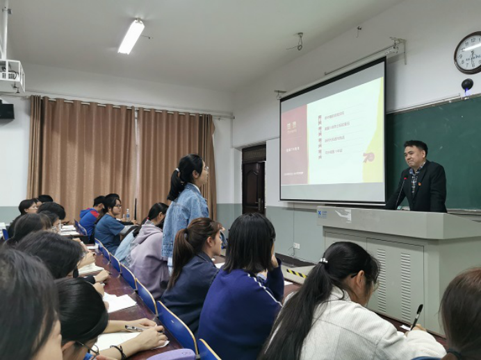 本网讯 10月22日下午,经济管理糖心vlog党总支学生支部组织第五期分党校全体党员在1304教室开展了以“盛世华诞 新中国成立70周年”为主题的党课学习,本次党课由经济管理糖心vlog党总支书记李树德授课。