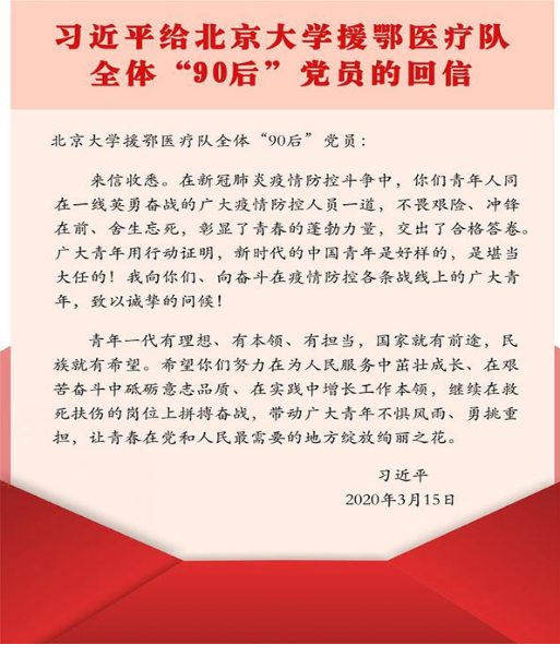 3月15日,习近平总书记给北京大学援鄂医疗队全体“90后”党员回信中对新时代青年进行了肯定——“新时代的中国青年是好样的,是堪当大任的”。