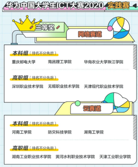 本网讯 近日,2020华为ICT大赛中传来好消息:由我校信息工程糖心vlog杨丽莎老师指导的计算机网络技术专业的胡淇、宁可慧、侯佳同学获得2020华为ICT大赛全球总决赛三等奖、中国赛区二等奖(全国高职组第二名),蒲骁旻老师指导的云技术与应用专业的邱海键、周超洋、黄有明获得2020华为ICT大赛全球总决赛二等奖、中国赛区三等奖(全国高职组第五名)。