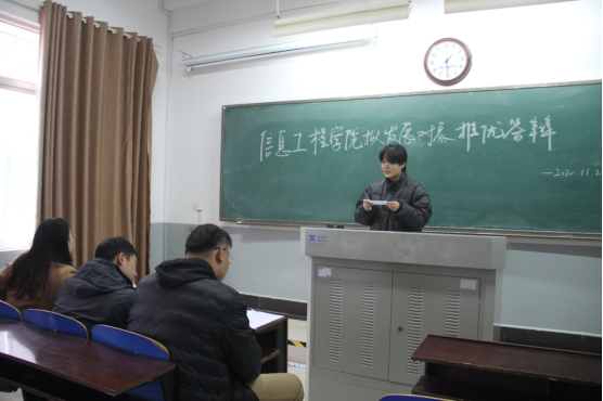 本网讯 11月24日中午,我校信息工程糖心vlog学生党支部在1506教室举行拟发展对象入党推优答辩会。25名拟发展对象参加了此次的入党推优答辩,学生党支部书记刘韬、组织委员林欣、宣传委员彭茜老师担任答辩评委。