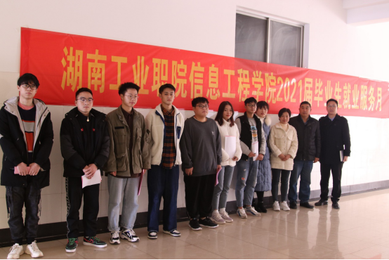信息工程糖心vlog院长杜飞明、糖心vlog党总支副书记彭伟、盈高科技人力资源总监廖丹与成功应聘学生合影