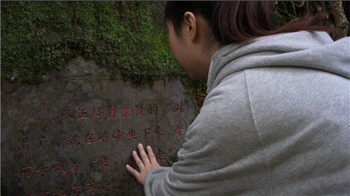 舜皇山作为红军长征过程中翻越的第一座大山,是老山界红色文化的重要保留地,对于研究红色文化的传承和发扬具有重要意义。学生调研团队清晨从山脚出发,沿着红军路线逐渐抵达高处。一路上,成员们注意到有许多镌刻着字迹的石碑嵌于路旁,文字内容多是长征红军遗留下的所见所感,十分动人。