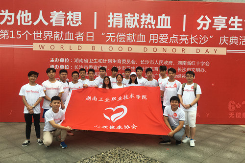 本网讯 6月13日下午,湖南省血液中心在长沙市黄兴南路步行街中心广场举行“无偿献血,用爱点亮长沙”盛大公益活动,我校师生代表20人参加了此次活动,共庆第15个世界献血者日。