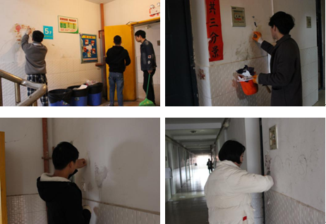 本次活动由三十多名团学干部自愿组织进行。早晨,志愿者在四栋宿舍楼门前集合,进行工具的发放和清扫区域的分配后,迅速投入到了清扫活动中。清扫过程中,大家着重对楼道内粘贴的小广告进行清理、对地面的卫生进行打扫,还楼道一片干净整洁。