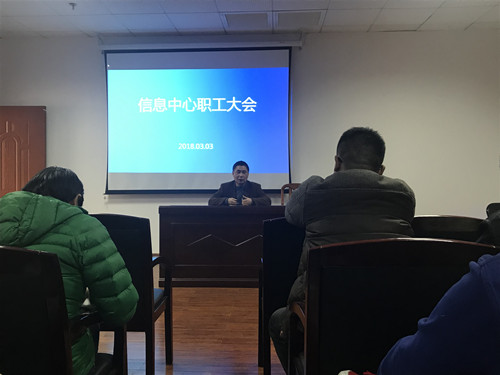 本网讯 3月3日,信息化建设与管理中心召开新学期职工大会,部门全体教职工参加。主任任东作动员讲话,会议由副主任周猷主持。