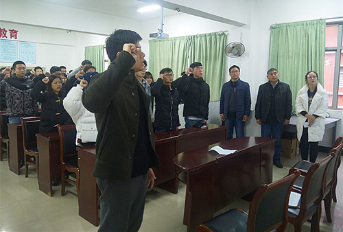 院长杜飞明宣读新党员名单之后,院团总支书记范小雨领读誓词,新发展的预备党员们庄重的举起右手,紧握拳头,面对党旗,表情严肃,铿锵有力的宣读誓词内容。短短一百多字的誓词是他们入党后对党的第一个承诺,每个党员都用发自内心的声音抒发对党忠诚的决心。