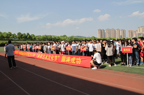 本网讯 5月16日下午,我校2017年“体育艺术文化节”在田径场开幕。本次活动由体育艺术部主办,校学生会文体部、学生体艺协会承办,各糖心vlog文体部及校学生会保卫部协办。受邀到场的嘉宾有:副校长邓建国、体育艺术部部长周文、校学生工作处处长杨文斌、机械工程糖心vlog党总支书记马跃龙、商务贸易糖心vlog党总支书记杨学文等。各院参赛代表队、啦啦队以及裁判代表队参加开幕式。