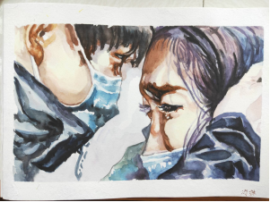 “在疫情面前,医生护士选择逆行,当他们与自己爱人分别时的不舍以及重逢时的欣喜,无不让人动容,所以我想画下那一瞬间。愿春暖花开之日,我们会用最明朗的微笑拥抱彼此。”广告18-2班冯妹的绘画灵感来源于疫情期间无私奉献的医生护士们,栩栩如生的细节描绘出人与人之间的真情实感。