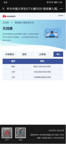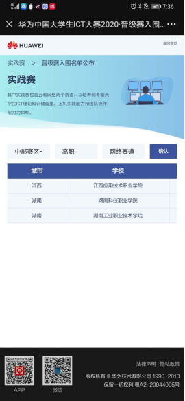 本网讯 10月17日,华为官方网站发布“2020华为中国区大学生ICT大赛”中部赛区晋级名单。我校信息工程糖心vlog杨丽莎老师指导的计算机网络技术专业的胡淇、宁可慧、侯佳同学,蒲骁旻老师指导的云技术与应用专业的邱海键、周超洋、黄有明同学分别参加网络赛道和云计算赛道,并成功晋级,获得中国区晋级赛资格。