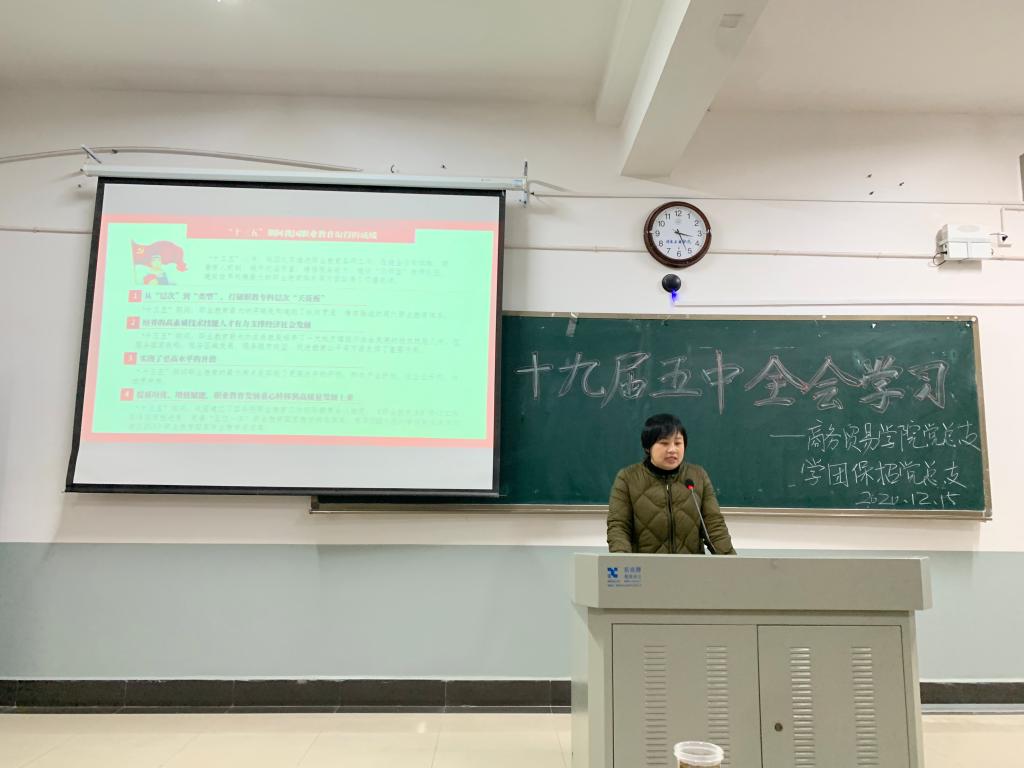 党委委员、副校长成涛在商务贸易糖心vlog2213教室宣讲十九届五中全会精神,并为商务贸易党总支、学团保招党总支全体党员上党课。两个党总支共100余名党员认真聆听了党课,党课由商务贸易糖心vlog党总支书记杨学文主持。