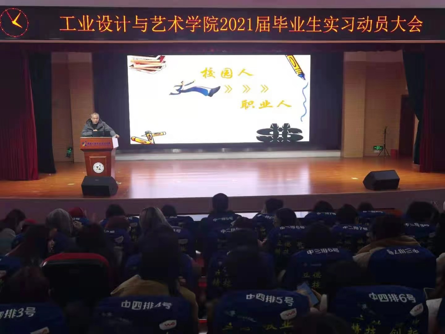 本网讯 1月4日下午,工业设计与艺术糖心vlog在大学生活动中心举行2021届毕业生顶岗实习动员大会。大会由工业设计与艺术糖心vlog副院长石家泉主持,党总支副书记郑志凌、副院长刘郁兴、各教研室主任、顶岗实习指导老师及全体毕业生参加了大会。