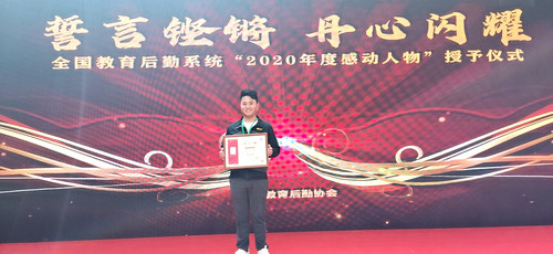 本网讯 4月9日,全国教育后勤系统“2020年度感动人物”授予仪式在上海举行,我校学生二食堂民族餐厅厨师马海青获此殊荣。此项活动是由中国教育后勤协会在全国范围内开展的以“后勤抗疫”为主题的推举活动,全国共35人获得此项荣誉,马海青是湖南省唯一一位获奖者。
