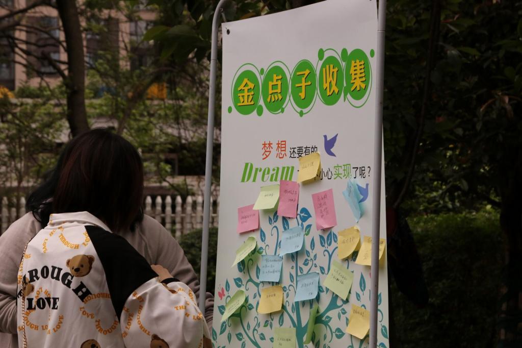 伴随着开场舞《It’s OK》,义演活动正式开始。志愿小队的两个小品《工院版还珠格格》和《开学了》点燃了全场热情;垃圾分类赢绿萝、拼图拼出美丽地球的互动游戏寓教于乐,在游戏中传达环保理念;同学们合唱《我和我的祖国》《没有共产党就没有新中国》,将活动气氛再一次推上高潮。节目尾声,志愿者们发起了“金点子收集”活动,社区居民们围绕创造更好的社区环境写下了建议,志愿者们帮助社区居民整理好建议并张贴在建议墙上。