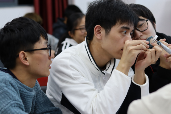 王快详细介绍了测量工具操作使用的基础、不同测量工具尺寸测量的实习、测量工具的定期检查等方面知识,强调了精密量具对机械加工的重要性。李建介绍了粗糙度仪、圆柱度仪、轮廓仪等形状类产品,现场学生表现出了浓厚的兴趣。陈艺炎趁热打铁,结合讲座内容,指导现场学生操作小量仪,动手测量产品,并就同学们关心的“如何保护量具与正确的使用量具”做了详细解答。同学们认真聆听,热情积极地参与到实践操作中,现场学习氛围浓厚。