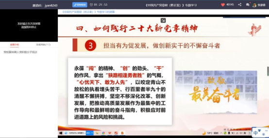 此次线上党课使全体学员了解了修改中国共产党章程的必要性和重要意义,也激发了学员们对党章的学习热情。全体学员一致表示,将切实做到旗帜鲜明、不忘初心、担当有为、清正廉洁,做一个坚定的践行者、忠实的服务者,将伟大建党精神与伟大自我革命相结合,为实现建设中国特色社会主义现代化强国的宏伟目标贡献自己的力量。