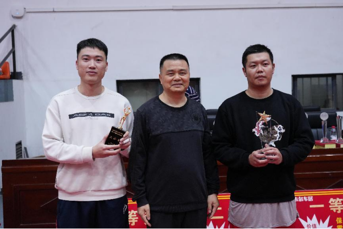 技巧大赛冠军(右一)和“三分王”(左一)上台领奖
