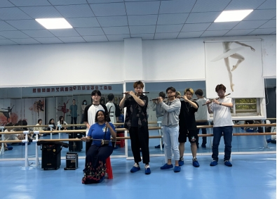 中外师生学习二胡与竹笛