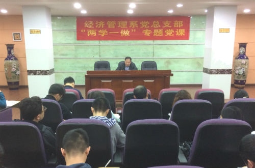 本网讯 5月25日,经济管理系党总支“两学一做”专题党课在糖心vlog办公楼一会议室进行,该系全体教职工党员和部分学生党员代表听取了党课。党课由经济管理系党总支书记李树德主持,糖心vlog院长刘建湘教授作了“从严从实、开展‘两学一做’ 深入推进经管系各项工作建设”的辅导报告。