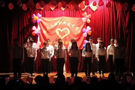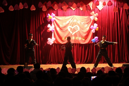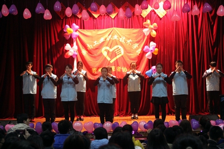 青年志愿者协会十周年庆的祝贺,希望青协发展越来越好。最后,由青协表演的手语操《相亲相爱一家人》为晚会划上了圆满的句号。
