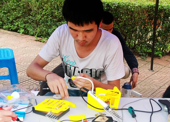 活动现场,一些老师拿着自家的电吹风等小型家用电器前来维修,同学们也带着大大小小的物品前来寻求帮助。