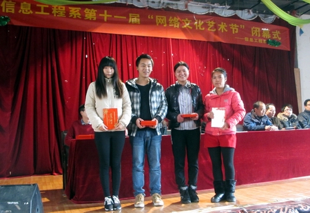 1月16日下午,信息工程系第十一届“网络文化艺术节”闭幕式暨颁奖典礼在大学生活动中心举行,信息工程系主任胡汉辉、党总支副书记肖望兵以及信息工程系全体干事和辅导员出席。信息工程系团总支文娱部李天宇同学主持闭幕式暨颁奖典礼。