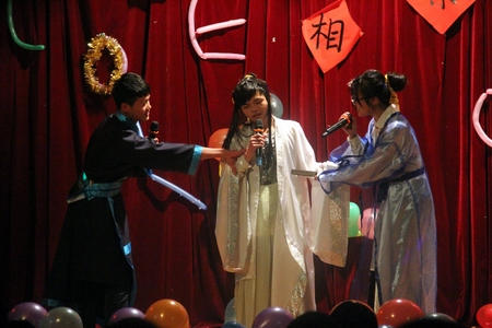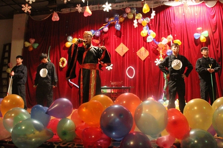主持人幽默风趣的开场白、保卫部开场舞健美操《苏珊娜》,瞬间点燃了晚会的热烈气氛。“四大天王”帅气开唱,歌曲串烧赢得阵阵欢呼;小品《如此面试》祝福大三学子顺利就业;激动人心的双截棍表演,将苹果放于头顶再用双截棍将其打碎,让女生看得心惊胆战,男生一阵高呼,瞬间掌声不断;小品《包青天之潘金莲》中“公正严明”的包青天和“婀娜多姿”的潘金莲的演出更是将晚会推向了高潮。晚会最后,一首《明天会更好》唱出了对生活的信念,对昨日的感怀,对明天的期待。