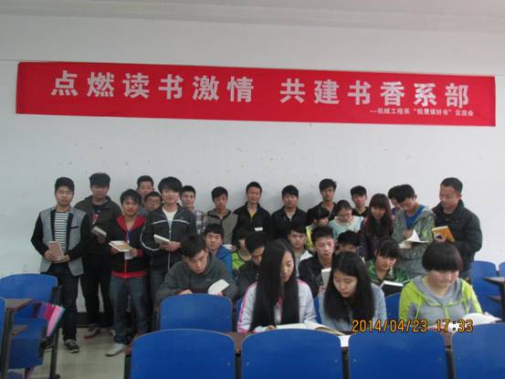 本网讯 4月23日是“世界读书日”,机械工程系团学联合会在1112教室开展了“我爱读好书”交流会。参加本次交流会的除了自发而来的机械系学生,还有商贸旅游系英语角的学员及机械系辅导员李雪艳老师。