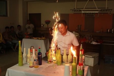 在第二部分花式调酒的讲授过程中,彭永清老师重点介绍了花式调酒的基本动作、动作间的衔接、协调以及调酒的基本要领,并邀请学生参与互动。彭永清老师还现身说法,进行了精彩的花式调酒表演,其对于酒与火超强的驾驭能力,引起全场轰动。