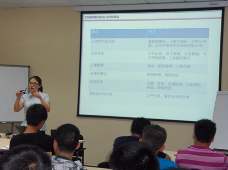学生在长沙卡斯马汽车系统有限公司听取企业相关负责人介绍企业概况